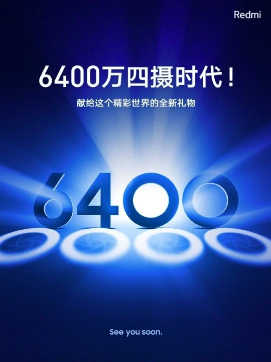 Hneď na to Redmi odhalilo ďalšiu fotku, kde teasuje svoj nadchádzajúci smartfón so symbolickou reprezentáciou štvoritých kamier, ktoré zahrnú 64 MPx senzor ako svoju primárnu kameru. V príspevku sa poznamenalo, že fotky vytvorené v režime 64 MPx budú mať veľkosť 20 MB.