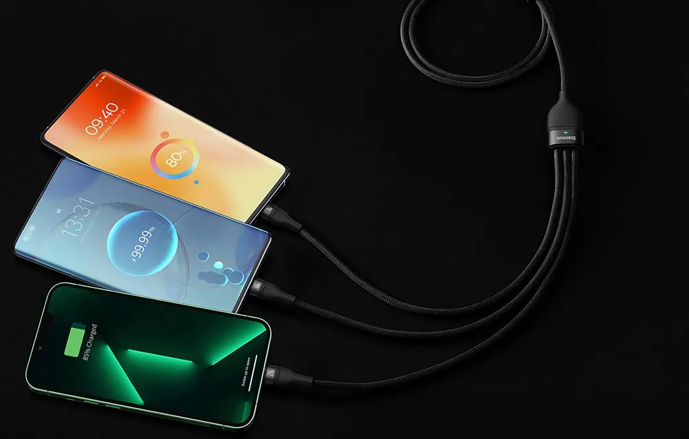 Už nemusíte používať viac káblov – kábel Baseus Flash II umožňuje pripojiť až 3 zariadenia súčasne! Vďaka 3 dostupným konektorom môžete nabíjať napríklad smartfón, iPad a stolný ventilátor súčasne. Navyše je výrobok kompatibilný s mnohými zariadeniami známych značiek. Umožňuje bezproblémovo nabíjať telefóny, tablety, bezdrôtové slúchadlá, powerbanky a ďalšie zariadenia!