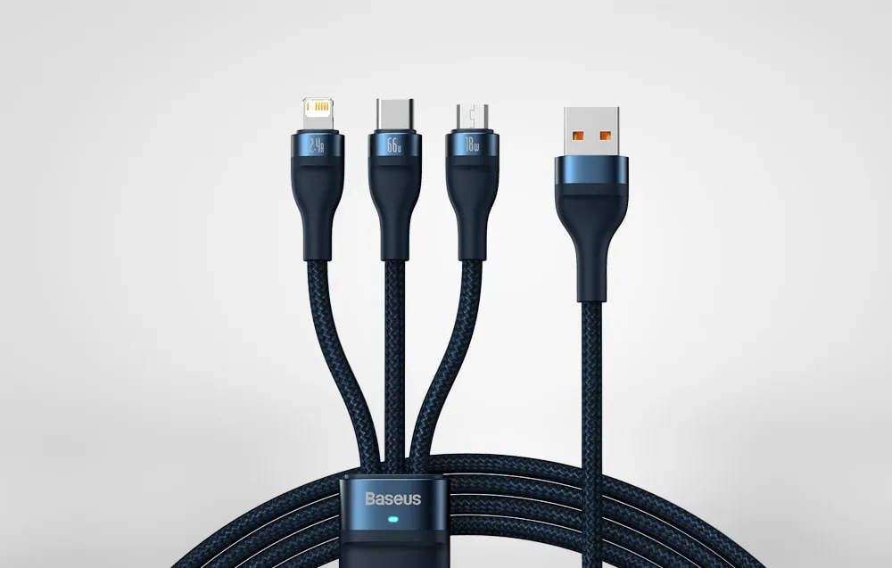Kábel Baseus má až 3 výstupné porty, takže budete môcť v okamihu obnoviť energiu v troch zariadeniach súčasne. Podporuje 66W rýchle nabíjanie a dokáže prenášať dáta rýchlosťou až 480 Mb/s. Vyniká tiež širokou kompatibilitou a bezpečným používaním. Okrem toho je vybavená svetelným indikátorom, ktorý informuje o prevádzke zariadenia.