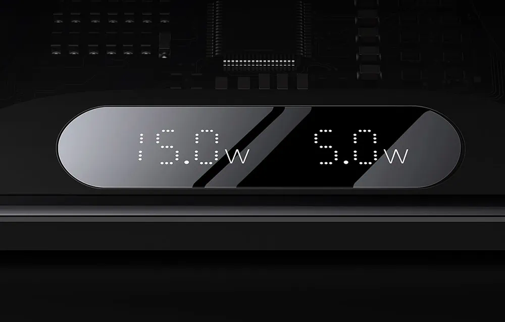 Nabíjačka má priehľadný panel, ktorý jej dodáva futuristický vzhľad a zaujímavo odhaľuje vnútro výrobku. Plusom je aj praktický displej, ktorý zobrazuje výkon nabíjania v reálnom čase. Silikónová podložka zaisťuje stabilnú polohu nabíjačky, navyše vďaka ľahkému dizajnu a hrúbke 7 mm ju môžete ľahko uložiť do batohu.