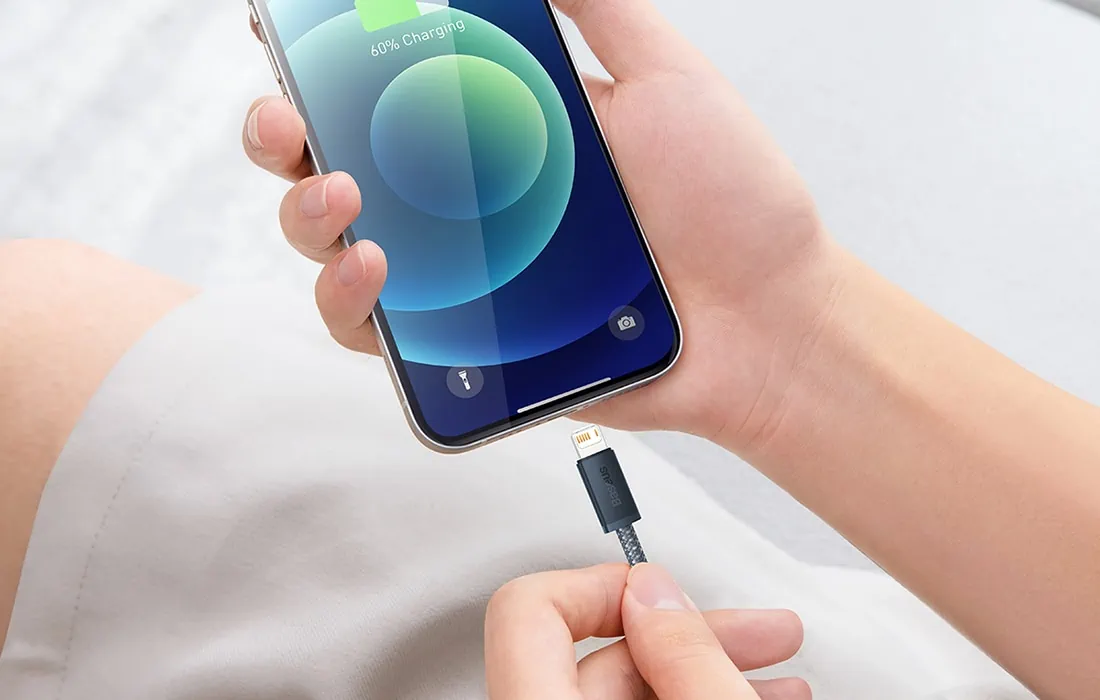 Kábel je vyrobený z vysokokvalitných produktov, ako sú komponenty ABS, ktoré odolávajú oxidácii a vyblednutiu. Gumené časti slúžia ako ochrana portov a kovových svoriek telefónu. Nylonový opletený plášť chráni kábel zvonku, čím zabraňuje deformácii a poškodeniu, ktoré je možné v dôsledku ohýbania. Kompatibilný so zariadeniami Apple od radu 12 po 6S.