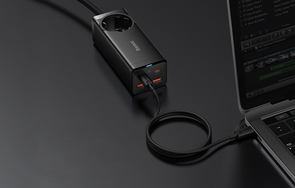 Rýchlo a bezpečne nabíjajte svoje zariadenia pomocou sieťovej nabíjačky / napájacej lišty Baseus GaN3 Pro! Produkt je vybavený 4 nabíjacími vstupmi, ktoré ponúkajú nabíjanie s maximálnym výkonom 100 W. Má aj zásuvku na striedavý prúd, ktorá vám okrem iného umožní pripojiť k elektrickej sieti projektor alebo rýchlovarnú kanvicu. Pokročilý systém ochrany zaisťuje najvyššiu úroveň bezpečnosti počas používania. Napájací kábel s dĺžkou 1,5 m vám poskytne väčšiu voľnosť, zatiaľ čo nabíjací kábel USB-C/USB-C, ktorý nájdete v súprave, vám uľahčí nabíjanie.