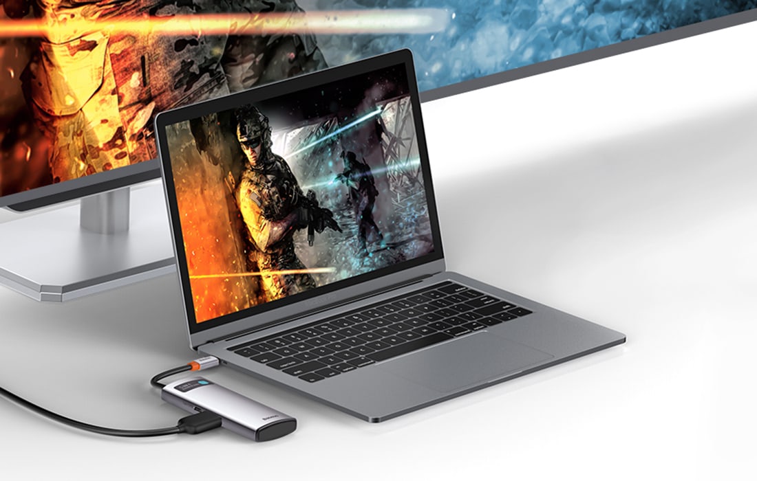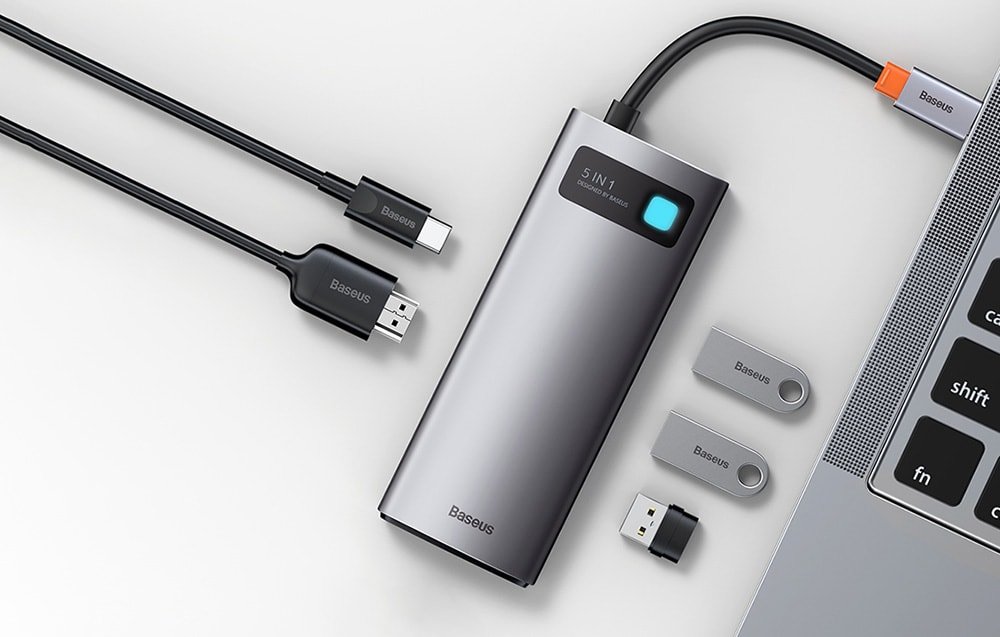 Pomocou rozbočovača Baseus môžete okamžite prenášať súbory (500 MB/s), rýchlo nabíjať zariadenia (PD 100 W) alebo zobrazovať súbory na väčšej obrazovke v perfektnej kvalite (4K@30 Hz). Príslušenstvo je vybavené až 5 portmi, takže sa už nemusíte obávať nedostatku vhodných vstupov na telefóne, notebooku atď. O stave zariadenia vás navyše bude informovať LED indikátor.