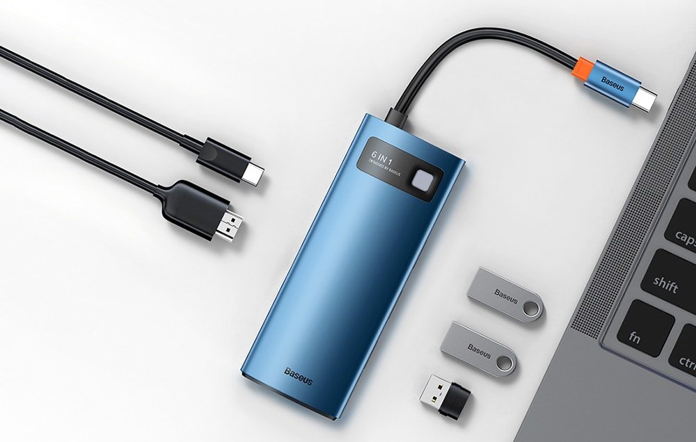 Pomocou adaptéra Baseus môžete okamžite prenášať dáta (500 MB/s), rýchlo nabíjať svoje zariadenia (PD 100 W) alebo zobrazovať súbory na väčšej obrazovke vo vynikajúcej kvalite (4K@30 Hz). S adaptérom WKWG000003 získate aj rýchlejší prístup na internet. Príslušenstvo je vybavené až 6 portmi, takže sa už nemusíte obávať nedostatku vhodných vstupov na telefóne, notebooku atď. O stave zariadenia vás navyše bude informovať LED indikátor.