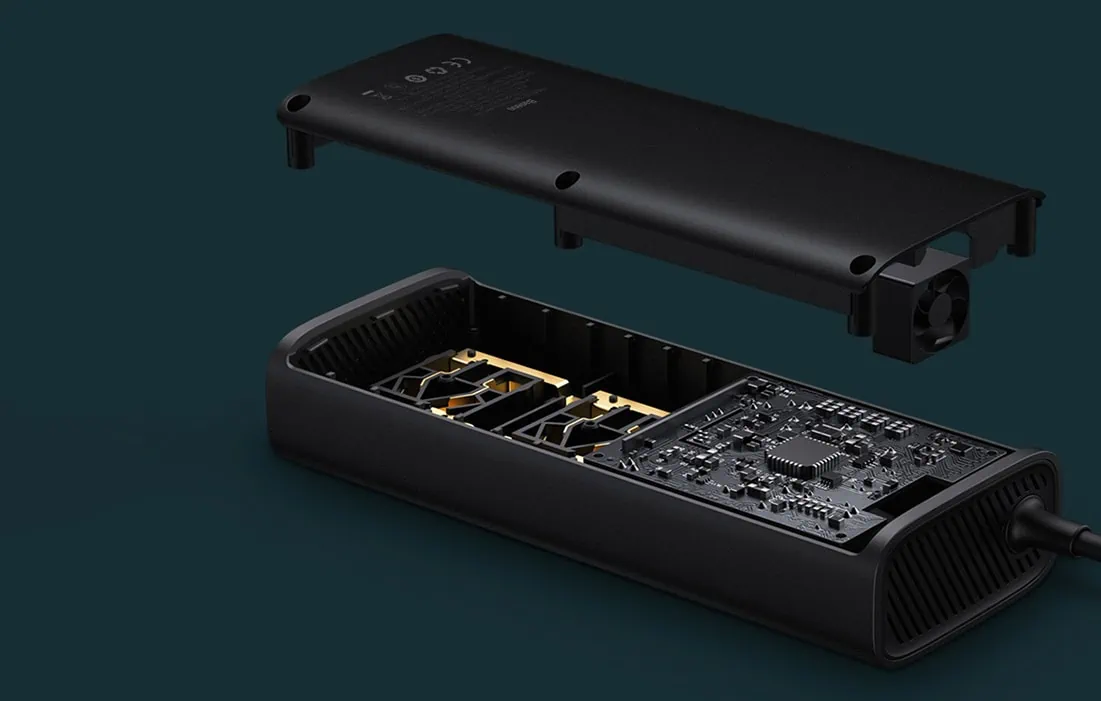 Menič Baseus vám umožní obnoviť napájanie viacerých zariadení pomocou 4 výstupných portov. Pomocou dvojitého portu AC nabijete napríklad notebook alebo stolnú lampu. Zatiaľ čo porty USB a USB-C vám umožnia nabíjať telefón, tablet, powerbanku alebo ručné ventilátory.