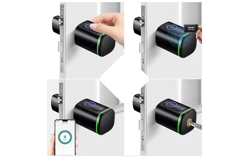 Vložka SDL-S1-S90 ponúka štyri rôzne spôsoby odomykania dverí. Odtlačok prsta umožňuje rýchle a bezpečné rozpoznanie používateľa, zatiaľ čo karta IC sa ľahko používa, takže je vhodná pre deti a seniorov. Aplikácia Tuya umožňuje diaľkové ovládanie prístupu, zatiaľ čo tradičný kľúč je núdzovou možnosťou.