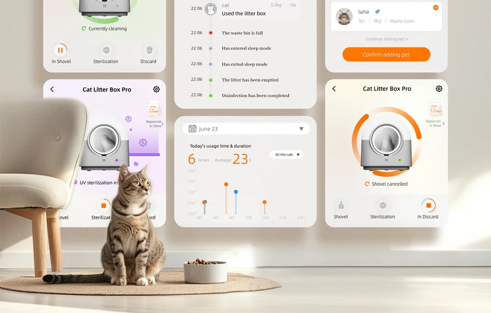 Super pomocnik. Aplikácia je veľmi prehľadná – umožňuje sledovať návštevy, váhu mačiek a posiela notifikácie (napr. keď je vrecko na odpad plné, po návšteve toalety)
