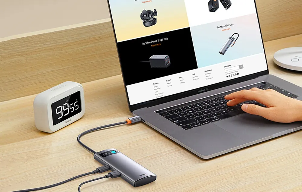 Budete používať modernejšie zariadenia? Žiadny problém! Rozbočovač je vybavený ďalším napájacím portom USB-C, ktorý podporuje vstupný prúd až 5 V / 3 A. Vďaka tomu môžete bez problémov používať aj vysokokapacitné pevné disky s kapacitou až 4 TB. S rozbočovačom Baseus sa nemusíte obmedzovať!