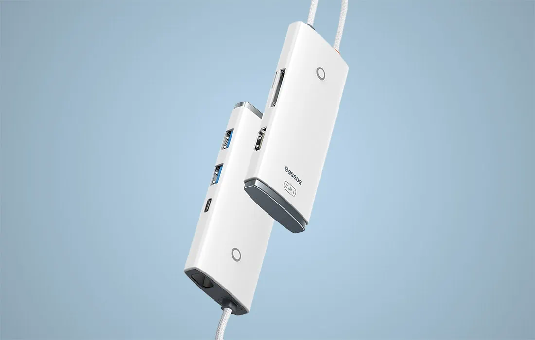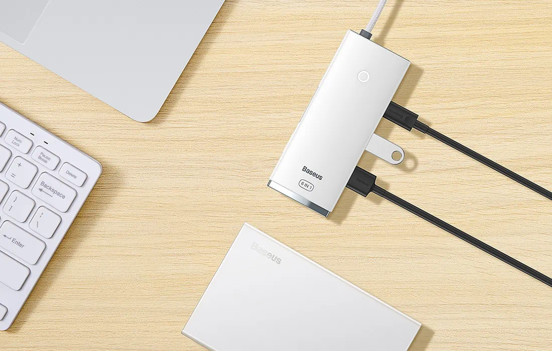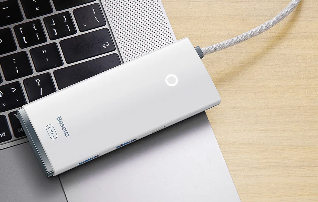 Rozbočovač Baseus sa vyznačuje kompaktným dizajnom, vďaka ktorému ho môžete úspešne uložiť do batohu alebo kabelky. Okrem toho sa o odolnosť zariadenia stará povrchová úprava z ABS plastu a kábel opletený odolným materiálom zaisťuje odolnosť voči opotrebovaniu. Okrem toho vás biely svetelný indikátor upozorní na to, že zariadenie pracuje.