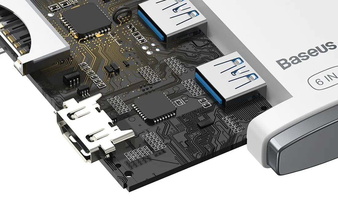 Rozbočovač Baseus je vybavený 2 portami USB 3.0 a portom USB-C, vďaka ktorým budete môcť prenášať súbory do iného zariadenia rýchlosťou 500 Mb/s. Zariadenie navyše podporuje spätnú kompatibilitu s rozhraním USB 2.0. V tomto prípade je prenosová rýchlosť 480 Mb/s. Na druhej strane, slot na kartu SD/TF vám umožní prenášať dáta do iného zariadenia rýchlosťou 60 MB/s. Okrem toho sa o stabilný signál a správnu prevádzku zariadenia stará zabudovaný čip.