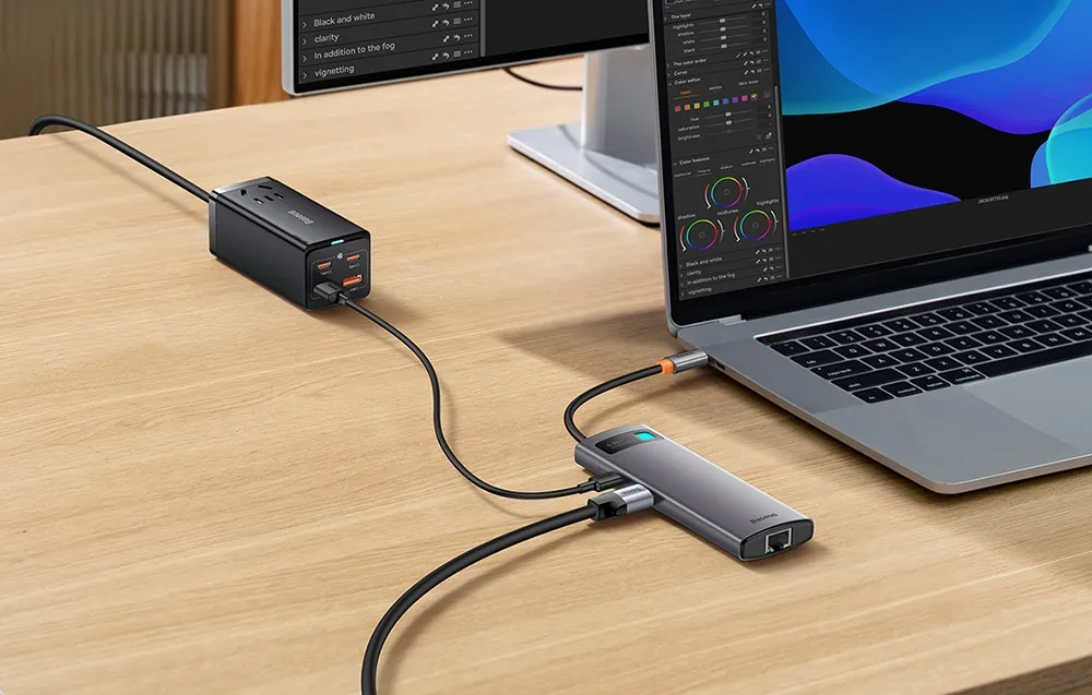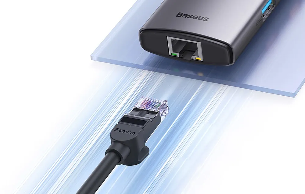 Rozbočovač Baseus je vybavený portom RJ45, ktorý podporuje prenos signálu rýchlosťou 1000/100/10 Mb/s. Vďaka tomu si môžete vychutnať rýchle, stabilné a pohodlné pripojenie. Navyše podporuje protokol rýchleho nabíjania PD 100 W, ktorý vám umožní okamžite obnoviť energiu zariadení, ako je smartfón, tablet alebo notebook.