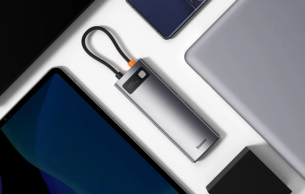 Rozbočovač Baseus 6 v 1 sa vyznačuje starostlivo premysleným dizajnom. Výrobok je vybavený modrým svetelným indikátorom, ktorý vám poskytne informácie o pracovnom stave zariadenia. Navyše to, že je vyrobený z hliníkovej zliatiny, sa premieta do ľahkého a odolného výrobku, zatiaľ čo matná povrchová úprava dodáva zariadeniu WKWG080013 štýlový vzhľad.