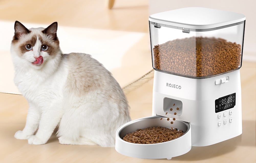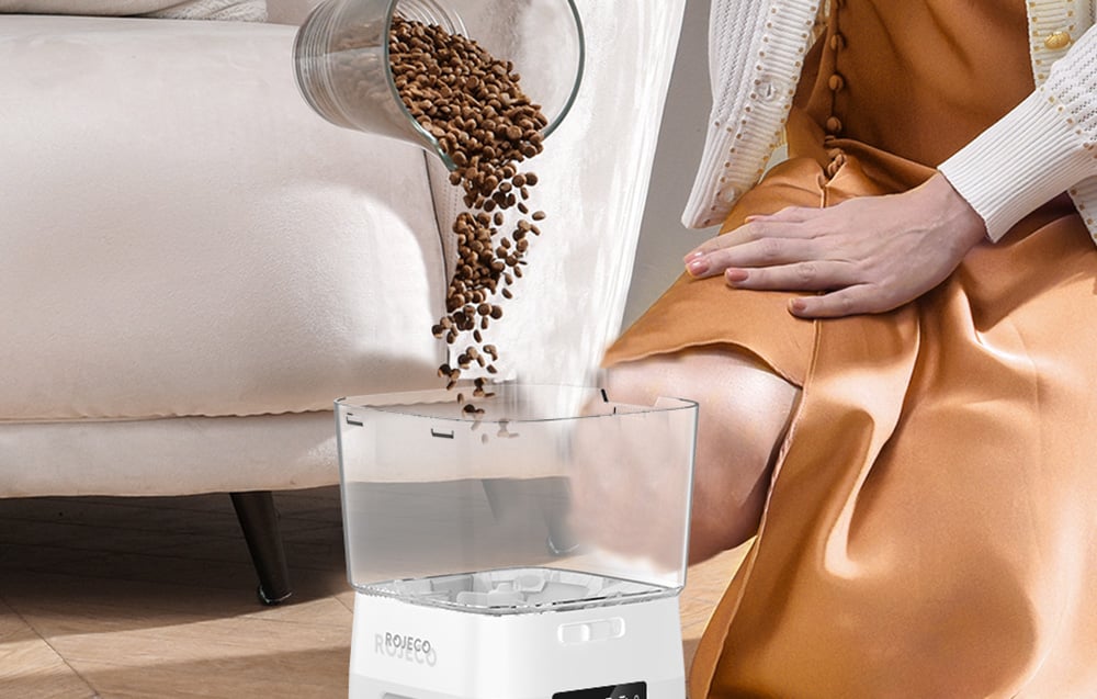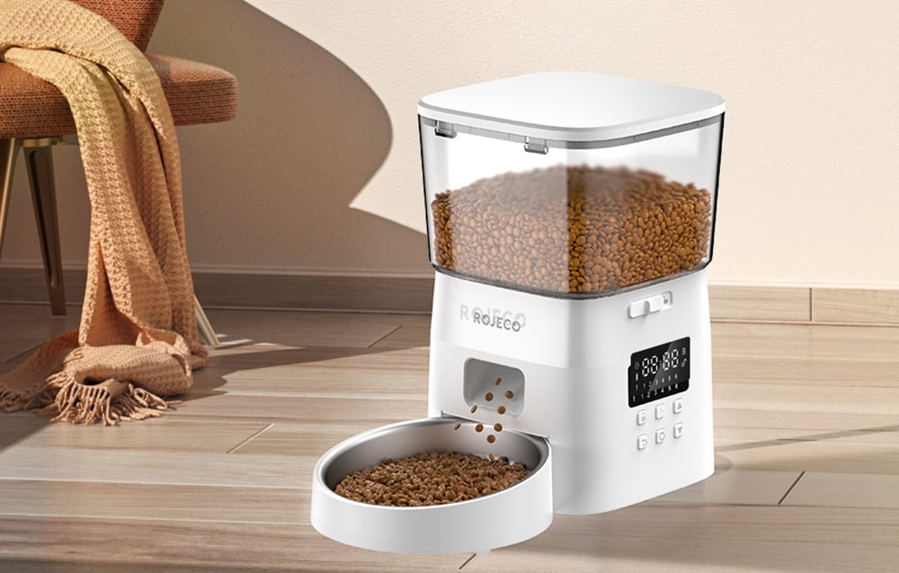 So zariadením Rojeco máte všetko pod kontrolou. Dávkovač je vybavený inteligentným panelom, ktorý vás upozorní napríklad na vybitie batérie a ďalšie. Navyše je nádržka na krmivo priehľadná, takže môžete pohodlne sledovať množstvo zostávajúceho krmiva a dostatočne rýchlo ho doplniť. K dispozícii je aj špeciálne blokovacie zariadenie, takže sa nemusíte obávať, že by sa váš domáci miláčik dostal k jedlu a zjedol nadbytočnú porciu.