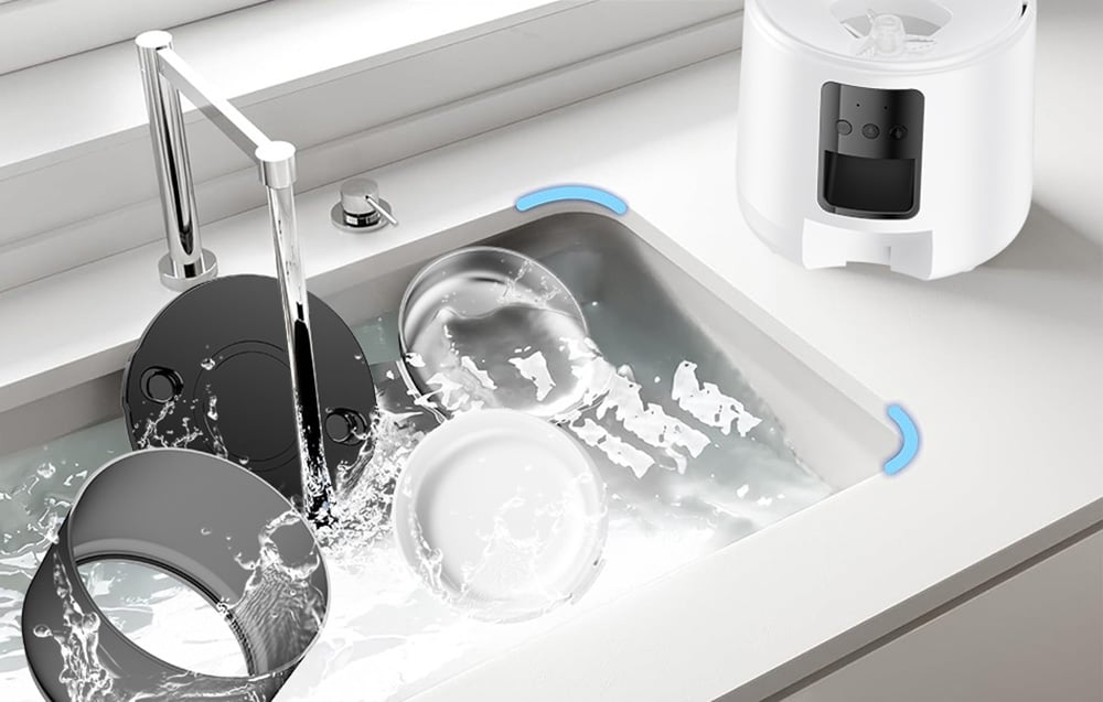 Trojlitrová nádržka na krmivo vystačí až na 15 dní kŕmenia, takže dávkovač je ideálnou voľbou na kratšie cesty. Všetky komponenty (okrem základne) sa navyše dajú ľahko vybrať a umyť, vďaka čomu zostane dávkovač dokonale čistý.