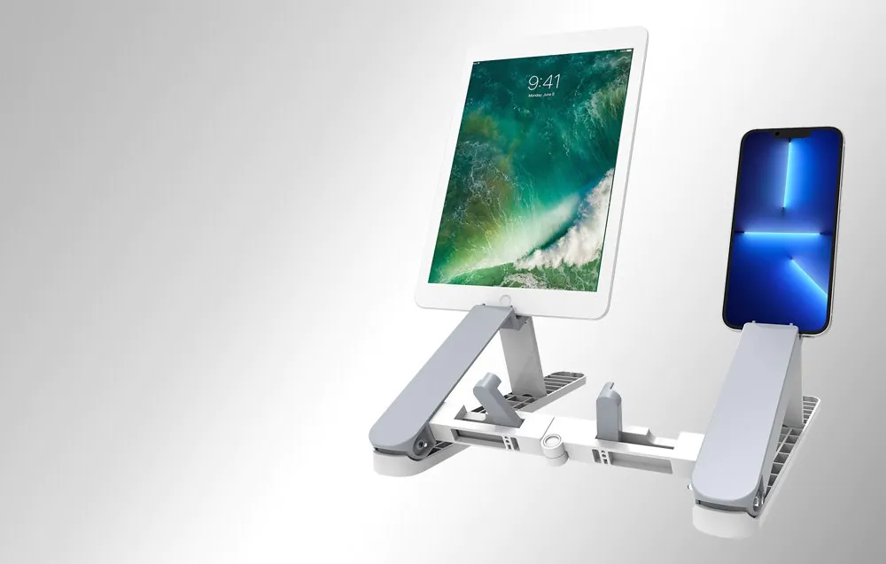 Sada obsahuje aj menší stojan, ktorý je ideálny pre tablet alebo telefón. Je vybavený niekoľkými praktickými podperami, takže naň môžete umiestniť 2 zariadenia alebo nastaviť smartfón do požadovanej výšky. Teraz môžete pohodlne sledovať film alebo si robiť poznámky! Menší stojan sa dá tiež pripojiť k väčšiemu stojanu na jednoduché skladovanie a prepravu.