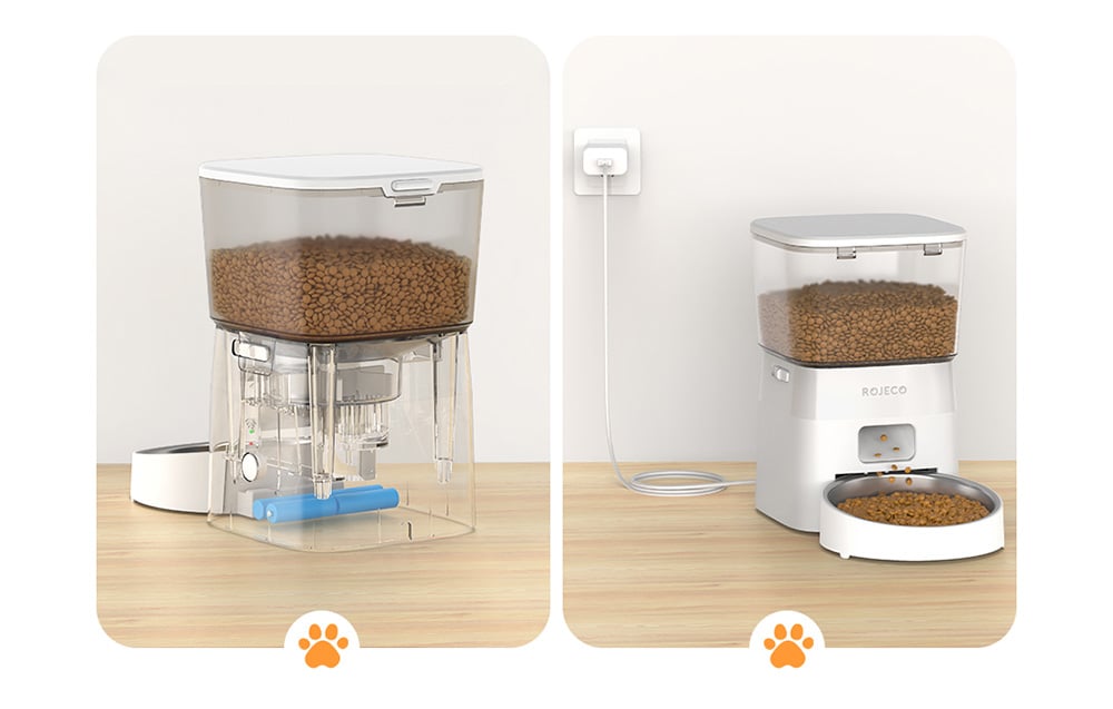 Inteligentný dávkovač krmiva pre domáce zvieratá Rojeco sa vyznačuje moderným dizajnom, inteligentnou funkčnosťou a spoľahlivosťou. Zariadenie umožňuje vzdialenú správu kŕmenia, presné ovládanie porcií a plánovanie, vďaka čomu je ideálne pre zaneprázdnených opatrovateľov. Okrem toho využíva mechanizmus proti prežúvaniu, ktorý zabezpečuje zdravé zásobovanie krvou v správnom čase, takže sa nemusíte obávať o zdravie a pohodu vášho domova. Kapacita zásobníka na krmivo je 2 litre a miska z nehrdzavejúcej ocele je odolná a nepredstavuje pre domáce zvieratá žiadne nebezpečenstvo. Zariadenie budete napájať 2 spôsobmi.