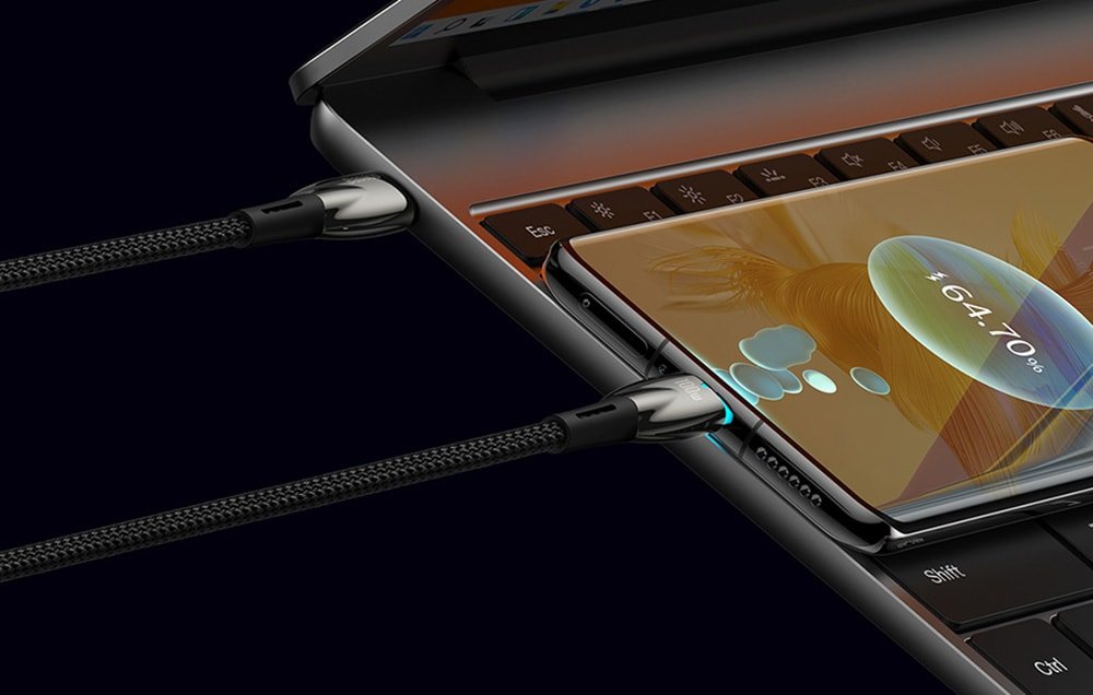 Kábel Baseus Glimmer s maximálnym výkonom 100 W rýchlo nabije váš telefón, tablet alebo notebook. na úplné nabitie batérie 16″ počítača AppleBook Pro stačia 2 hodiny. Zatiaľ čo 2,4 hodiny je čas potrebný na úplné nabitie iPadu Pro 11″. Na maximálne nabitie konzoly Nintendo Switch stačí 2,5 hodiny.